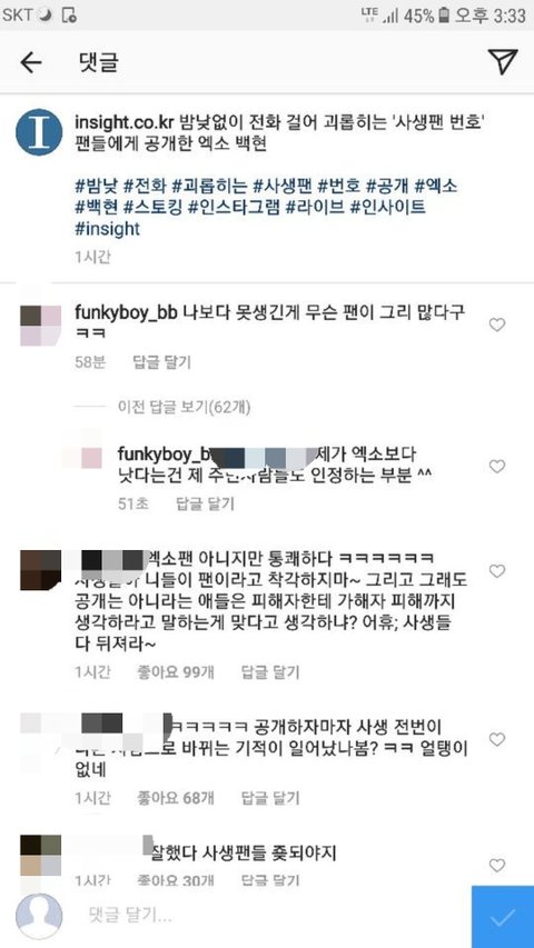 욕을 하고가고, 인스타는 차단을 하면 그 사람의 댓글이