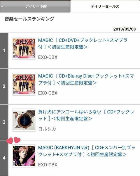EXO-CBX『 MAGIC』 오리콘 데일리 앨범 랭킹 1위