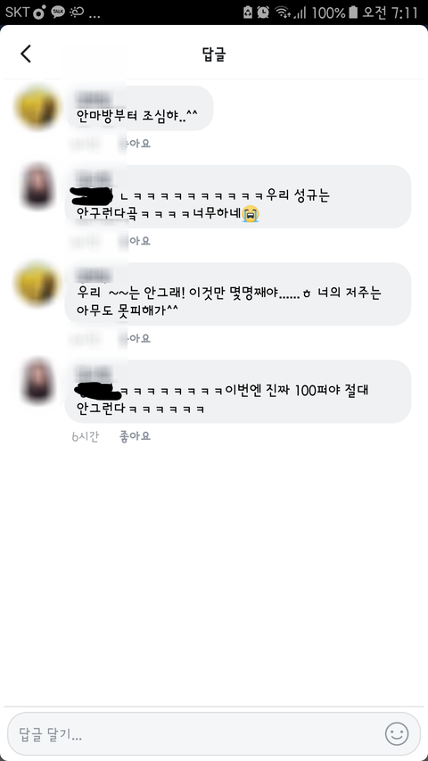 이거 sns에서 타가수가 임신했다는 글에 어떤 인스피릿이 친구 태그해서 '성규가 이러면~' 이런식으로 댓글 단거에 대댓글 목록이야