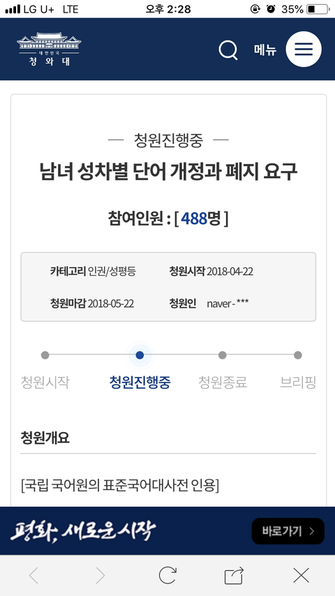 4월에 올라온 청원인 것 같은데 참여자가 매우 적습니다. 이것은 비단 여성만의 문제가 아닙니다. 남녀 모두가 평등해지는 세상을 위해 청원에 참여해주세요!