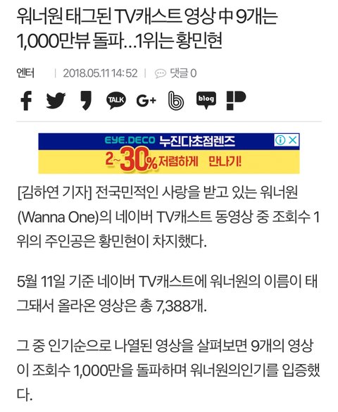 기사)ㅇㄴㅇ 태그된 TV캐스트 영상 中 9개는 1,000만뷰 돌파…1위는 황민현