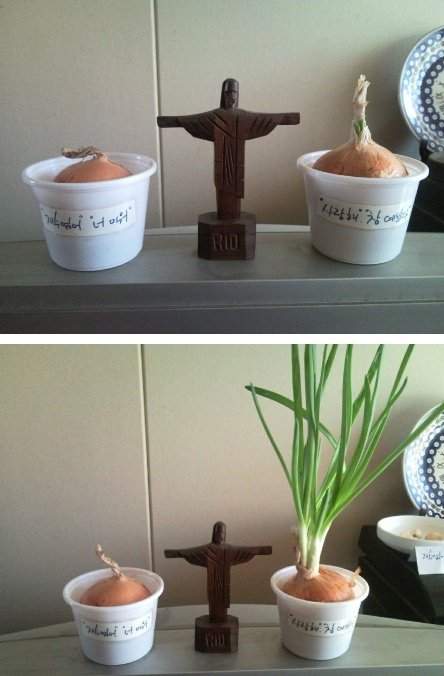 내가 양파를 두 개 놓고 말의 힘에 대한 실험을 한 적이 있습니다. 왼쪽 양파에게는 ‘너 미워. 재수 없어’라고 써서 붙여 놓고 날마다 그렇게 말했고, 오른쪽 양파에게는 “사랑해. 참 예쁘다”라고 써놓고, 날마다 그렇게 사랑하는 마음으로 말했습니다. 그러자 결과가 나타났습니다. 사랑 받은 양파는 자라났고, 미움 받은 양파는 자라지 못했습니다. 놀라웠습니다. 말은 정말 살아 있고, 결과를 만듭니다.