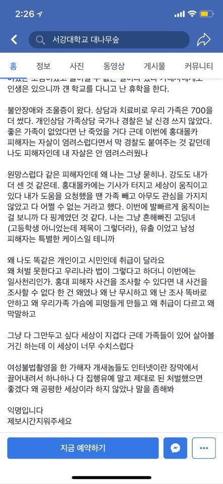 서강대에서 여자분이 자기 성관계동영상이 유출됐는데 홍대사건과 달리 명백히 의심가는 유포자가 있었는데도 제대로 수사 안해줘서 800만원까지 썼는데 집유....이 여성분은 홍대사건 보면5 얼마나 원통하고 원망스러웠을까