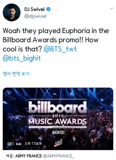 프랑스 음악 채널에서 빌보드 뮤직 어워드 중계 프로모션을 위한 영상에 배경음악으로 삽입됐대 방탄 ㄹㅇ대단함