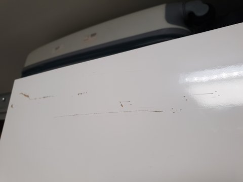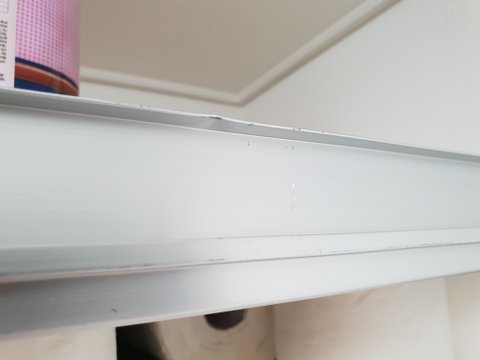억지로 슬라이딩문을 잡아당겨 경첩부분이 휘어 쇠끼리 부딪혀 심하게 끽 소리가 났으며 무리하게 맞추다 보니 철가루가 아래에 심하게 떨어져 있었습니다