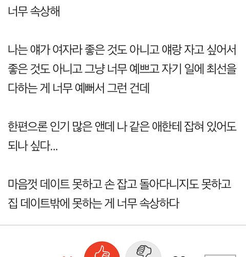손 잡고 밖에서 다니다가 뒤에서 욕도 먹어봤고 학교 친구들 만날까 봐 떨리고 아무 사이 아니면 그냥 다니겠어도 들킬 게 있으니까 그렇게 당당하게 못해