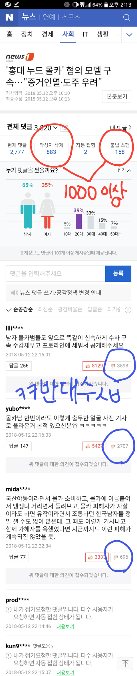 왜^^ 니들말대로 홍대누드남사건 잘 처리됐으니 이제 소라넷 120만명 회원도 똑같이 처벌받고 뉴스 헤드라인에 얼굴 걸려야지ㅋㅋㅋㅋ왜반대하니 찔리니?ㅋㅋ