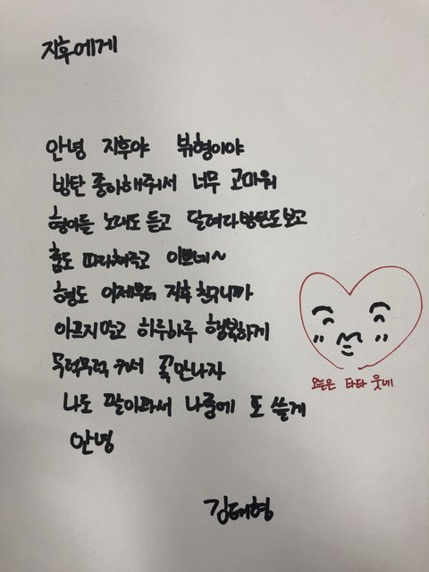내가 좋아하는 가수가 느꼈을 뿌듯함이 태형이 편지로 다 느껴져 태형이가 얼마나 뿌듯했을까 자신이 만든 노래를 듣고 행복하고 친구도 생기고 인생이 바뀌고 있다는데 내가 가수도 아닌데 괜히 막 감동이고 그런다...