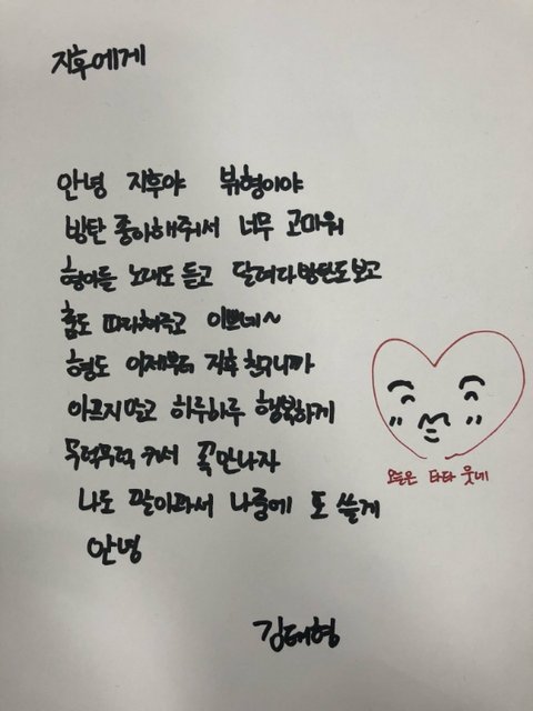 나는 만약 태형이가 이걸 보게 된다면 트위터로 짧게 말하거나 다른 데서 언급하거나 그럴 줄 알았거든 근데 손편지로 이렇게 답장해줄 줄 몰랐어ㅠㅠㅠㅠ 게다가 지후가 쓴 내용 하나하나 다 답해주구ㅠㅠㅜㅠㅠㅜ나 정말 반성한다 태형이는 내가 생각했건 것보다 훨씬 따뜻하고 세심하고 어른스럽고 자상하고 좋은 사람이었어ㅠㅠㅜㅠㅜㅠㅜ 또 한 번 치였어 진짜루 너무 좋다 오늘 떡밥 안 떠도 행복할 거 같애 우오어유어우유ㅜㅜ사랑해 태형아 지금 너무 감격스러워서 짤을 좀 많이 올렸어..