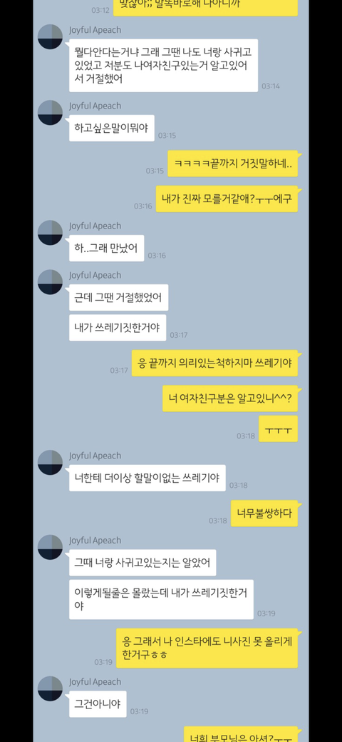 그러자 “17년도 9월부터 많이 힘들었는데 너가 해준 위로들이 마음에 와닿지 않았어. 그렇게 사랑하는 마음이 없어졌고 그냥 재밌던것 뿐인데 미국여행가면 괜찮아 질거같애서 말안했다고”이러는 겁니다.