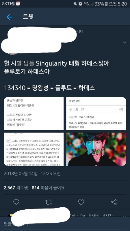 나는 매번 태태가 자꾸 맨 위에 있다고 생각이 들었단 말야. 윙즈 때 검은날개의 태태도 그렇고 석진의 세계와 자꾸 반대되는 것도 그렇고 BT21 세계관에서도 외계에서 온 타타로 맨날 뭔가 조종하고 위에 있는 느낌이었어. 플루토=하데스.... 태태 캐릭터에 죽음의 신을 조금 주입한 것 같아. 태형은 알면서도 모른 척 친구들과 청춘을 즐기려했으나 불의의 사고가 생겼고 스스로 물 속에 자신을 버렸는데 석진이 자꾸 죽음을 되돌리고 죽음을 숨기고 그러니까 잘못되고 있단 걸 느끼는거지.