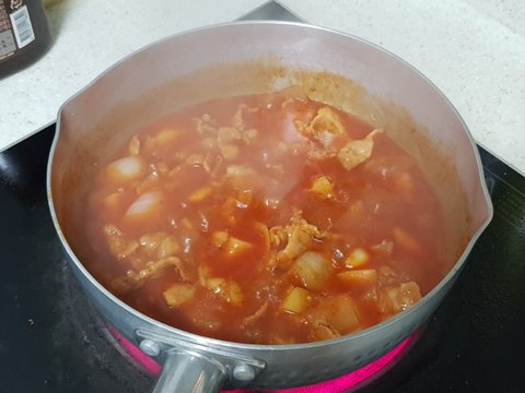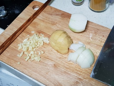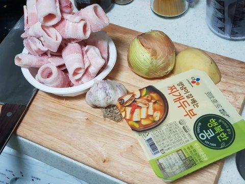 재료는 돼지고기, 양파, 마늘, 감자, 기타양념(간장 고추장 고춧가루 소금 후추 등) 등등 입니다.