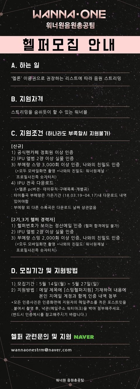 워너원 음원총공팀 4기 헬퍼 모집 워너원 컴백 음원 총공에 함께해주실 헬퍼 분들을 모집합니다. 지원 조건, 지원 방법 예시를 꼼꼼하게 읽으신 후 문의 및 지원 부탁드립니다
