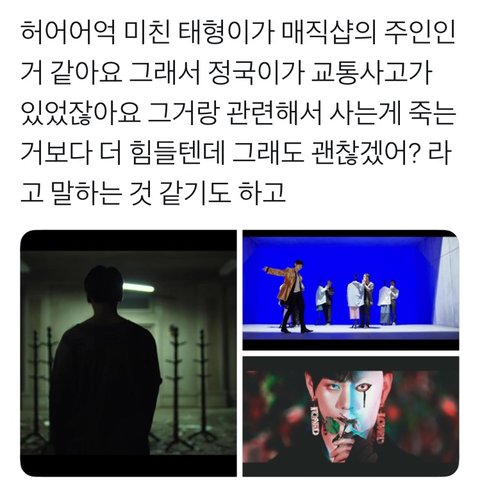 어제 태태가 하데스(죽음의신) 이냐는 궁예도 봤는데.... 정국이한테 생사와 관련된 질문 하는 게 넘나 찰떡인데??