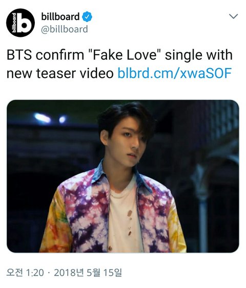 빌보드가 트윗에 Fake Love 티저 올려줌 정국이 썸넬도 멋지다