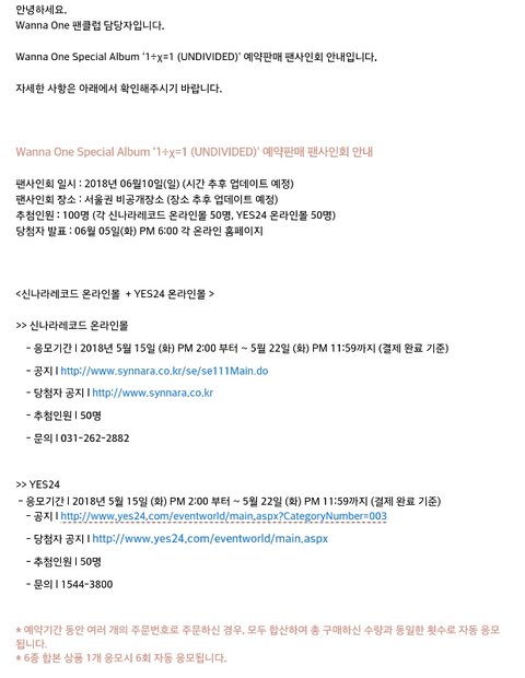 Wanna One Special Album ‘1÷χ=1 (UNDIVIDED)’ 예약판매 팬사인회 안내