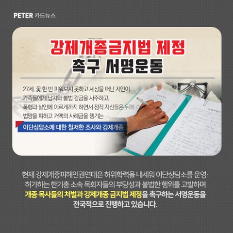 부디 이 땅에서 강제개종금지법이 속히 제정될 수 있도록 여러분들의 관심과서명을 부탁드리는 바입니다!!여러분의 손으로 제 2의 피해자를 막을수 있습니다!