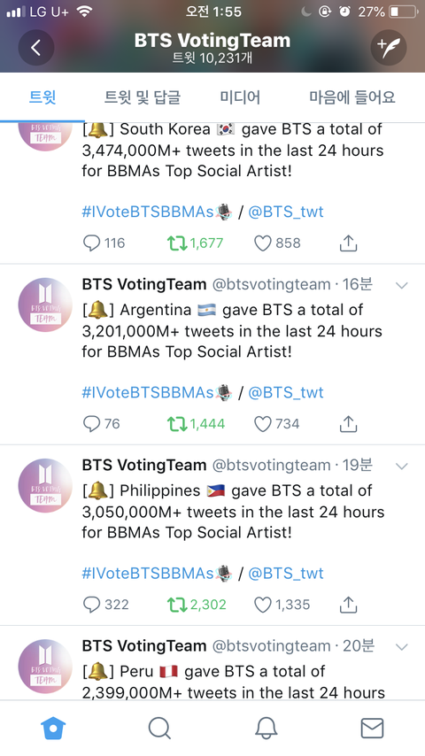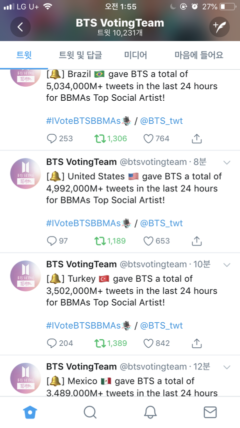 저거 올라오는거 실시간으로 봤었거든 한국 나왔을때 와 우리나라 진짜 우리이삐들 열일했다!! 이럼서 약간 눈물 날라 했는데...... 방금 브라질 미국 터키 멕시코 보고서는 쏙 들어감ㅋㅋㅋㅋㅋ 진심 리스펙트 이럴때 쓰는거 아닐까..ㅋㅋㅋㅋㅋㅋ 너무 멋있고 고맙고 그르네
