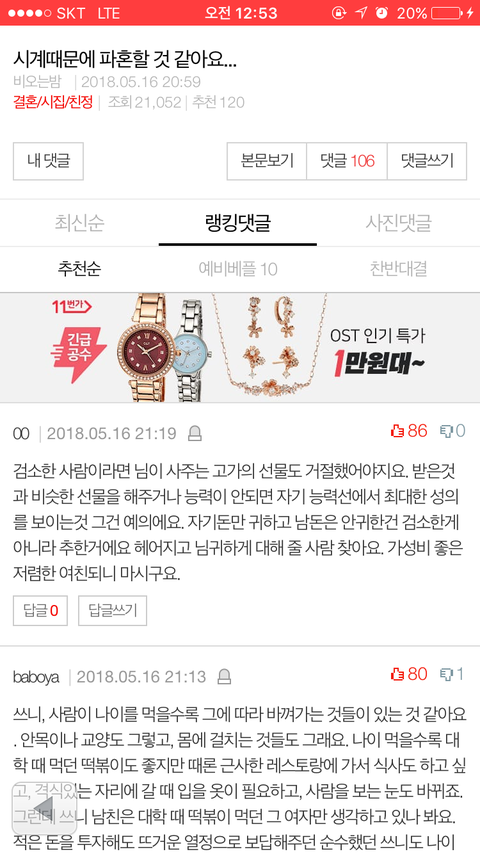 그런 사람들한테 6주년 선물로 결혼을 약속한 사람에게 OS* 시계 받았다고 진짜 말 못하겠어요.