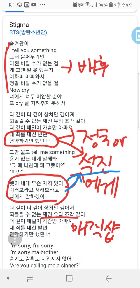 슈스비하다가 가사가 걸려서 봤는데 숨겨왔다고 계속 후회하고 슬퍼하는 가사가 있잖아 그게 태형이가 매직샵 그 사람이기 때문인거지. 그리고 표신못햇는데 널 지켜주지 못해서는 정국이에게 하는 소리라고 볼수있고, 깨진유리조각 같다라는건 이번 티저에서 남주니가 깨진 유리조각을 건넸잖아? 해석은 못 하겠지만 연관은 잇는거같아. 그리고 내 죄를 대신받던 연약하기만 했던 너는 희생당하는 정국이일수도 있고 아니면 자신이 행한 일때문에 자꾸 타임슬립하는 석진이가 안쓰러워..? 암튼 그런감정 때문에 석진이에게 하는 소리일 수도 있어..!!!