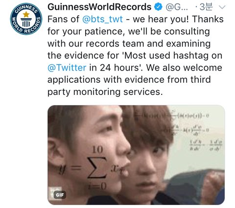 bts 팬여러분! 기다려주셔서 감사해요! “24시간동안 가장 많이 사용된 해시태그” 관련해서 우리 레코드팀이랑 상의하고 조사할 예정입니다. 또한 제3자 입장의 증거도 환영합니다.