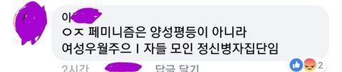 제가 페미니스트,페미니즘에대해 요즘 공부중인데 전 페미니즘이 억압된 여성인권를 되찾아 남여평등을위해 운동하는 ? 것이라고 생각하는대 이 댓글을보고 너무이해가안되네요..페미니즘이 실현되야하는건 당연하다고 생각하는데 ㅆㄹㄱ라니......페미니즘이라는 단어가 불편하면 전 성차별주의기때문에 불편하다거 생각합니다. 저 댓글이 맞는 발언인가요? 전 이해할수가없네요...
