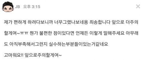 근데 얼마전부터 제이비가 팬들이랑 소통하고싶다고 약 1000개 넘는 댓글들 달아주는데 답글 받은팬들은 제이비의 성격을 잘 아니깐 대부분 너무너무 고마워하고있고 지금 뭐 팬들한테 싸가지 없다고 욕먹는댓글은 일부의 일부인거고 처음 덕질해본 사람들은 상처받을 수있다고 생각해