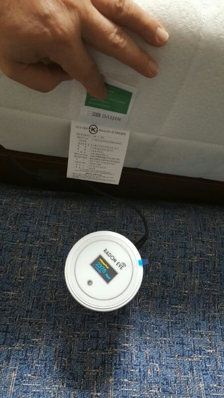 대진침대때문에 어제 페닉에 빠졌어요. 4월3일 대진침대를 구입했는데 5월3일 라돈사태가 터지고 대리점가서 환불해달라고하니 본사하고 얘기하라고 하더군요. 그리고 본사와 대리점에서는 우리가 구입한 침대는 시기적으로 아무 문제가 없다고 하더군요. 그런데 평소 몸이 약한 아내가 계속어지럽다 하여 어제 라돈아이로 라돈을 측정해보니 2,376Bq/m3 (우리나라 기준은 148)이 나오더군요. 그리고 우리 침대는 제조일도 없어요(사진). 완전 방사능 덩어리. 어제 부랴 부랴 비닐로 테이핑하고 일단 복도로 내어 놨어요. 오늘 대진 본사와 원자력안전위원회에 전화를 해 보겠지만 받을지도 모르겠고, 정말 황당하네요. 도움주시면 감사하겠습니다.