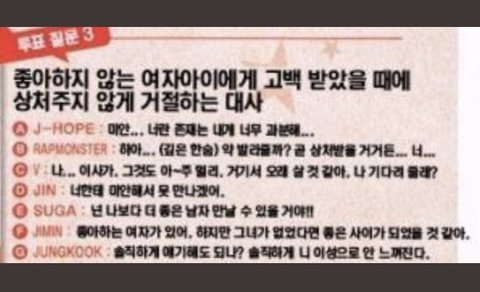 정국이는 질문에 ‘상처주지 않게’라는 말을 잊은거 같곸ㅋㅋㅋㅋㅋㅋㅋㅋㅋ태형이 순수 그 자체.. 짐니 배려 천재... 핑크몬을 상기시키는 오글 대사.. 그리고 민윤기.. 너란 나쁜 남자!!!!!!! 네가 제일 나빵ㅜ.ㅜ