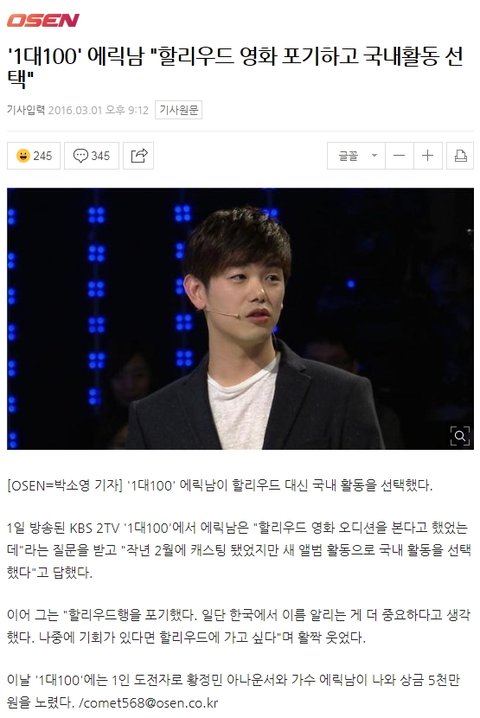 에릭남이 글리 쌍둥이 역할에 탑3까지 올라가서 최종탈락했었다 했잖아