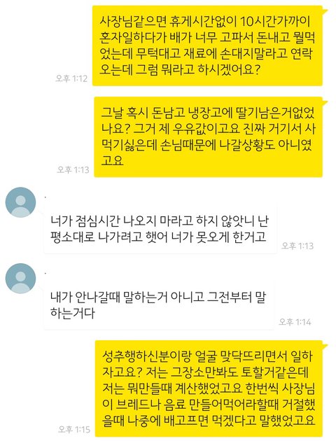 근데 그일 이후 오전9시부터 오후6시,7시까지 혼자 방치해두면서 사장은 폰cctv화면을 손에서 놓지못하고 지켜보다가 우연히 내가 입에 무엇을 넣는 장면을 확보하고 결제안한거면 배상청구하겠다면서 꼬투리를잡는 협박문자 달랑 하나 날라옴.
