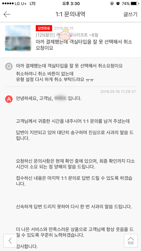 5, 다음날 5/16 첫번째 남긴 취소신청에 대한 답글이