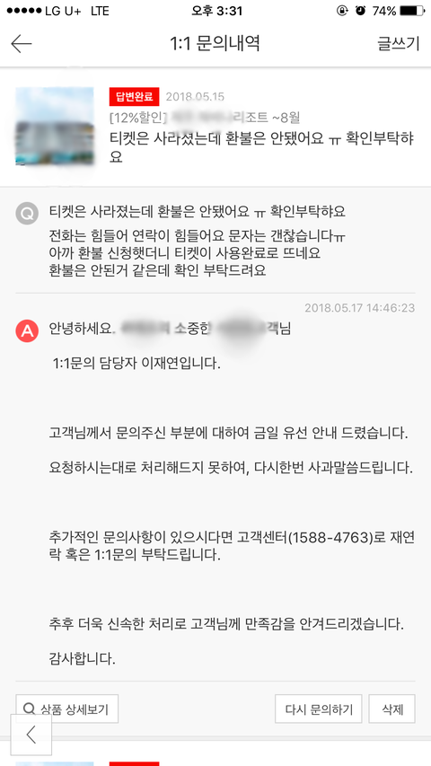 진상규명을 해달라는 글을 5/18 고객센터쪽에 다시 올렸습니다