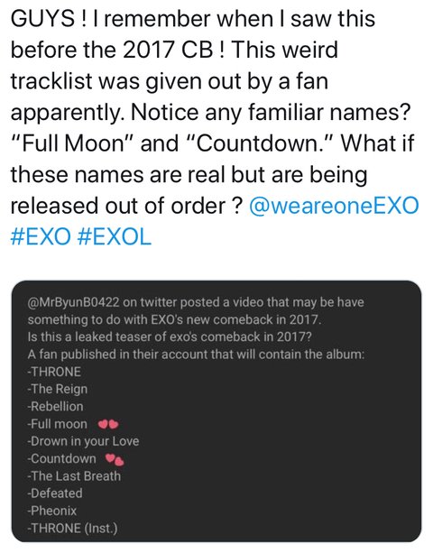 ㅈㄴ 이거 기억나냐???? 트랙리스트 유출 어쩌고 했던거ㅋㅋㅋㅋㅋㅋ 이 중에 countdown 이랑 full moon은 나온 거랑 해외팬들이 그 마즈뮤직 사람이 next album will be fire 이렇게 말한 거 보고 다음 앨범 Phoenix 아니냐고 함 ㅇㅇㅇ 불사조 ㅈㄴ 그럴싸하지않음????ㅋㅋㅋㅋㅋㅋㅋㅋㅋㅋㅋ