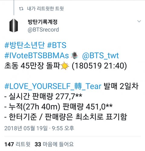 발매 하루 지났는데 45만장이면.. 초동기간이 일주일이랬나... 얼마까지 갈라나 나 쫌 무섭네...