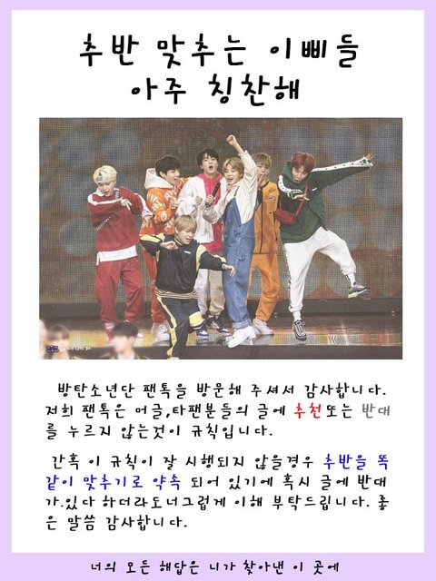 저는 방탄소년단의 팬이 아니에요 그렇다고 다른 연예인의 팬도 아니구요 누군가를 이렇게 열정적으로 좋아할 시간도 여유도 없는 아주 평범한 학생이에요 그럼에도 팬톡에 찾아 와서 이런 글을 쓰게 된 건 오늘 정말 특별한 경험을 했기 때문이에요