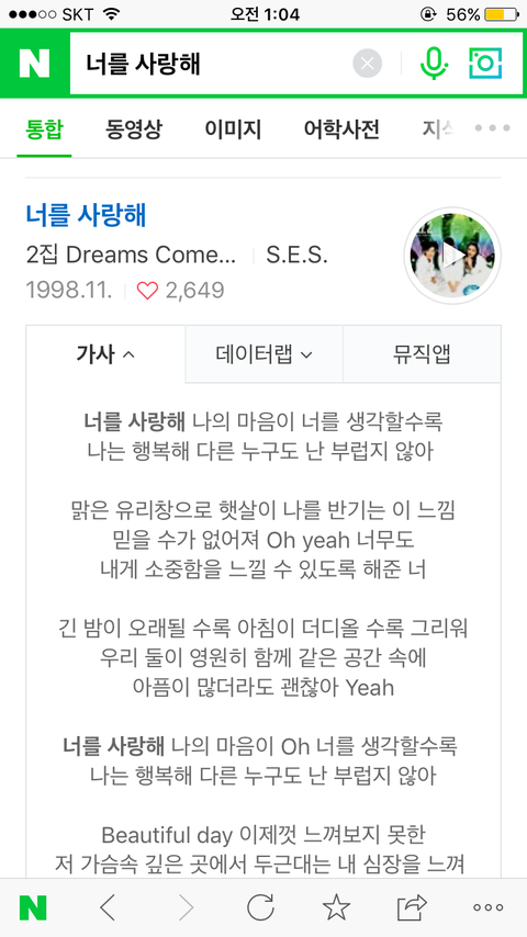 전화하다가 노래불러달라길래 SES노래중에 너를 사랑해 가 갑자기 떠올라서 예예예예~이러면서 노래 가사는 안말하고 콧노래로 불렀는데 걔가 갑자기 컷컷 ! 이러면서 거기까지만 부르라는 식으로 했어... 내가 평소에 노래부르면 절대 반응 안이러고 끝까지 불러달라하고 막 그러거든 .. 그래서 내가 이노래 알아?이러니까 대답제대로 안하고 말 흘리면서 다른이야기 하려고하고 ㅠㅠㅠㅠㅠ나 진짜 SES좋아하고 갑자기 떠올라서 아무생각없이 너를 사랑해 콧노래로 부른건데 ..얘 이거 백퍼 노래 가사 다 알면서 그만하라고 한거겠지 ..? 근데 왜 그만부르라는거였을까 ㅠㅠㅠㅠ