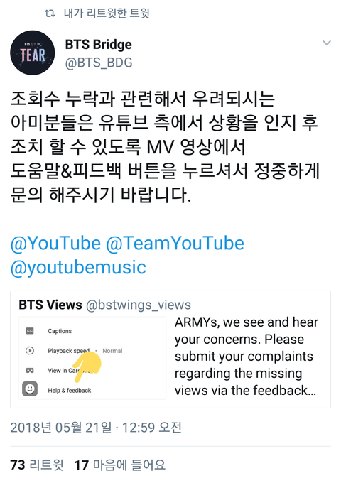 야 답변 이건 아니지~ 그럼 광고주들이 보는 조회수를 따로 만들어주라 그래 이것 때문에 조회수 까는건 말도 안되는 일이야 다른 가수는 안그러면서 왜 방탄만 그러냐?