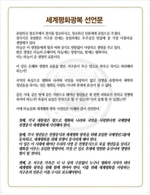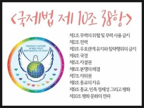 하여 HWPL 이만희 대표는 이 세계의 전쟁을 종식시키기 위한 해법으로국제법을 제정할 것을 주창하였고, UN 국제법을 만드는 법조인들이 HWPL 이만희 대표의 뜻에 적극 동참하여 제10조 38항의 국제법이 제정되어 이를 UN에 상정하여 모든 국가의 각 나라 대통령에게 사인할 것을 종용할 것입니다.