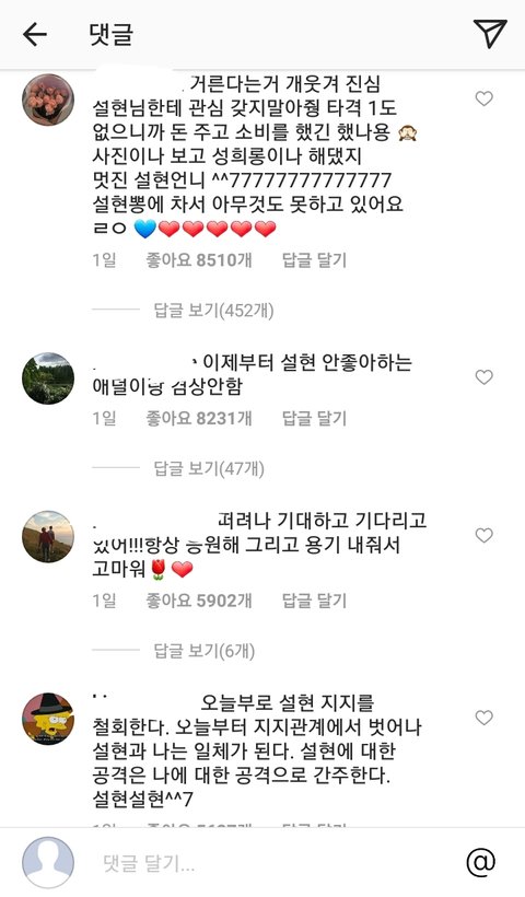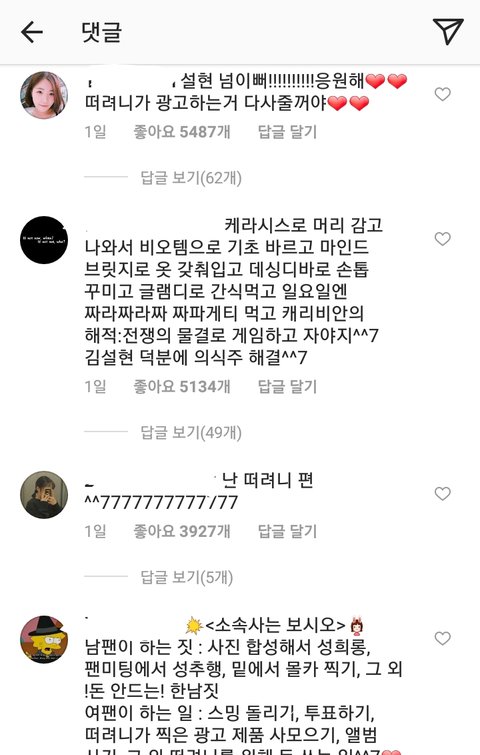 설현은 별 생각 없이 팔로잉 정리 좀 한건데 지들끼리 북 치고 장구 치면서 댓글 점령하고 있음ㅋㅋㄱㅋㅋㅋ ㅈㄴ 웃겨