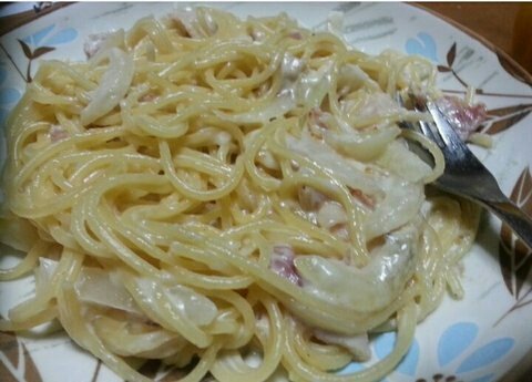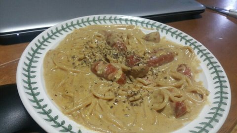 카레스파게티는 우유에 고형카레 4분의1, 후추, 계란 노른자로 소스만듭니다!