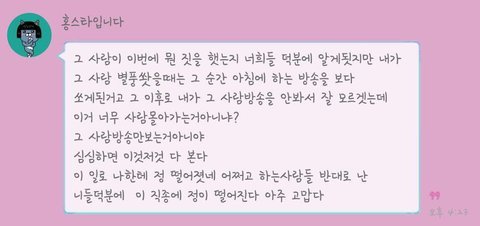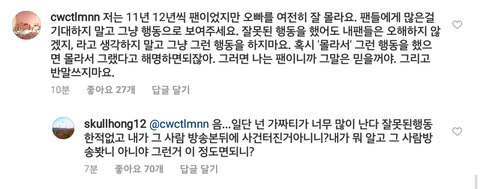 처음에 얘기꺼낸 팬들은 부드럽게 얘기하고 걱정하는 식의 말투였는대 갑자기 혼자 화내면서 댓달고다님.