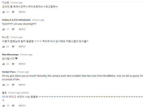 너무 감사합니다. 빌봇영상 보다가 막혔던 속이 시원하게 뚫리는 기분. 우리 진이 너무 잘해서 보는 내내 흐뭇해. 안정적인 라이브에 카리스마 넘치는 눈빛. ㅜㅜ