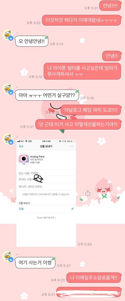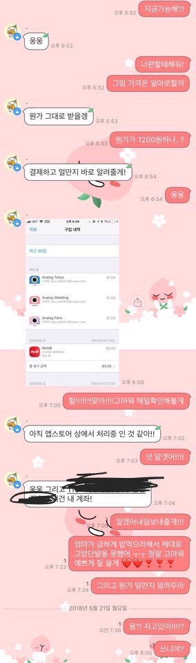 어제 아날로그 필터를 사고싶은데 엄마가 못사게 하셔서 판에서 대리결제를 부탁한 판녀와 오픈채팅을 열어서 선물하기로 필터 세개를 받았단말이야 !!! 근데 돈 입금은 내일 해준다고 했는데 얘가 보내주고 아무 말도 없는거야 여태 톡도 안보고ㅠㅠㅠㅠ 원가가 얼만지 모르겠는데 알려주겠다면서 여태 연락도 안되고 돈은 입금해줘야되는데 어쩌지 진짜. ㅜㅜㅜㅜㅜㅜㅠㅠㅠㅜㅠㅠㅠㅠㅠㅜㅜㅜㅜㅜ ㅠㅠㅠㅠㅠㅠㅠㅠㅠㅠㅠㅠ