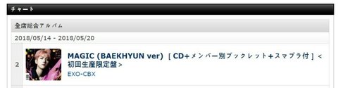 5월 셋째주 전지점 타워레코드 차트 2위 매직 백현 버전