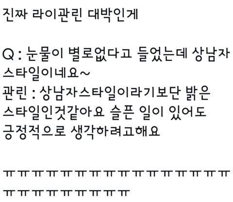 관린이가 속해있는 남바완의 유닛컨셉이 남자다움 이런거여서 다 자기가 생각하는 남자다움을 말했는데 라이관린이 자기가 어렸을때부터 생각했던 남자다움은 가족들에게 모든걸 서포트 해주는거래ㅠㅠㅜㅜㅜㅜㅠㅠㅠㅠㅠㅅㅂ 그런남자가 제일 멋있는거 같대