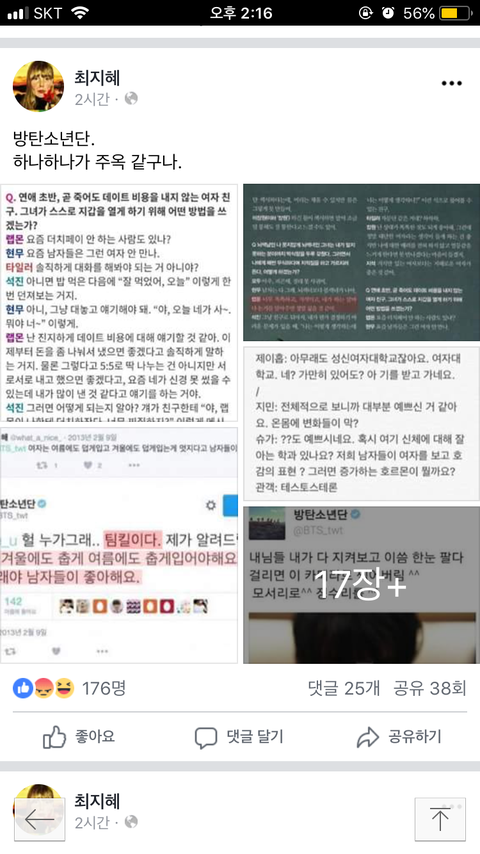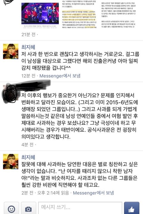 쓰니 댓글보니까 감잡히네. 쟨 변질된 페미니스트야. 쟤는 너죽고 나죽자, 니들이 여자에게 한 행동은 죽을때까지 잊지않고 곱씹으며 복수할거야, 라는 태돈데. 이게 무슨 페미야ㅋㅋ 끝까지 남자여자 나눠서 서로 욕하겠다는건데 ㅋㅋ한 공간에 서로 다른 두 성이 서로를 이해하고 존중해서 함께 잘살아보자가 올바른 페미니스트의 태도지. 그래서 제대로된 페미들은 관행을 고치려고 들지 개인을 비난/비판하려고 하지 않아. 관련 책 몇권만 읽어봐도 알텐데. 방탄의 경우는 잘못을 사과했고 다시 되풀이하지 않는다는 점에서 페미니스트인 내가 보기에 전혀 문제없음. 저건 그냥 현실이 매우 불만족스러워서 누구라도 잡고 욕하고싶은데 이해는 받고싶은 ㅂㅅ이라고 본다.