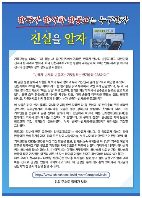 안녕하세요~요즘 신천지에 대한 뉴스가 언론사와 신문기사에 빈번히 올라오고 있습니다.신천지 하나를 무너뜨리고자 신천지와의 전쟁을 선포한 한기총과 CBS!!