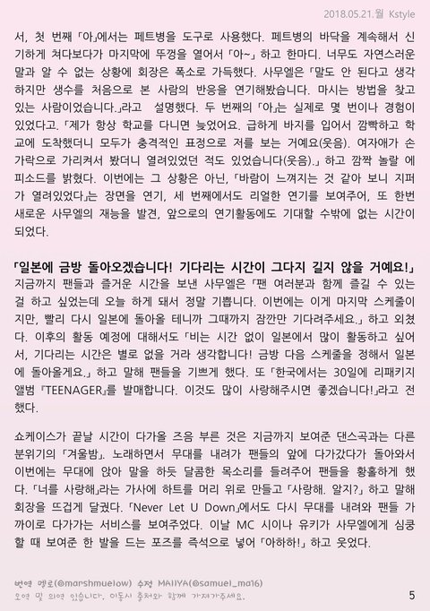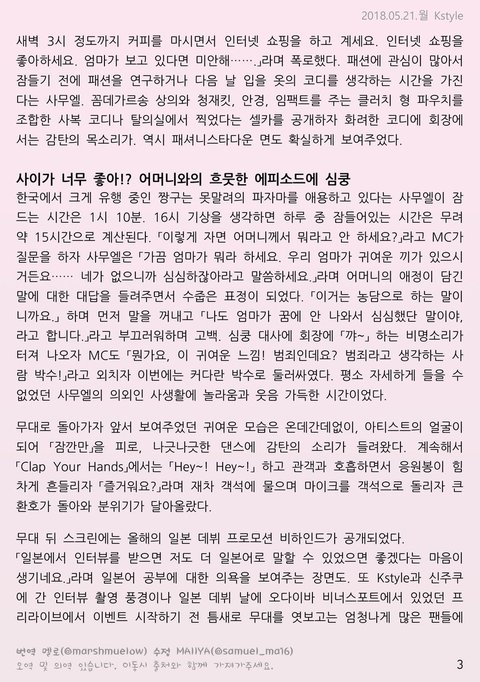리포트읽고 일본쇼케에서 춤노래얼굴본거 보다도 쉬는날 하루일과 얘기해준거 직접 들은게 젤젤 부러워졌어ㅜㅜㅜ 엄마가 꿈에안나타나서 심심했다고 대답한것도 너무 다정하고 귀엽고 물을 처음본사람 연기한다는 발상도 독창적이라 멋있다공ㅜㅜ