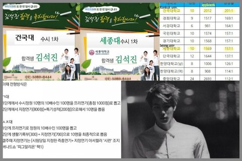 그리고 많은 사람들이 오해하는데 진 건국대 연극영화과 나온거 연예인 특례 이런거 없이 데뷔 전 고딩 때 수시로 200:1 뚫고 합격한거야. 세종대도 동시합격했었대. 그래서 건국대 1학년 때 등굣길 버스에서 내리는거 빅히트 매니저가 보고 잘생겨서 캐스팅한거래.